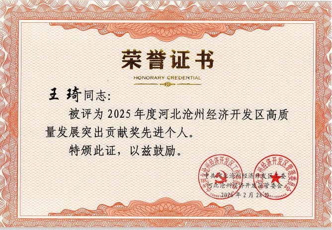 喜報|王琦榮獲滄州經(jīng)濟開(kāi)發(fā)區2025年度高質(zhì)量發(fā)展突出貢獻獎先進(jìn)個(gè)人